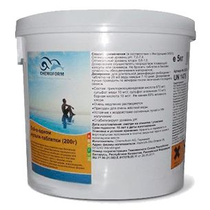 200-граммовые таблетки, пригодные для воды любой жёсткости, растворяется очень медленно, рН нейтральный, стабилизирован от скоротечного распада