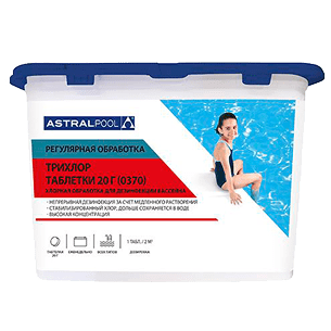 Медленнорастворимые многофункциональные таблетки на основе стабилизированного хлора, в состав которых входят так же альгицид и флокулянт: не только обеспечивают эффективную дезинфекцию, но и предотвращают появление водорослей и мутности в воде. За счет специальной формулы предотвращают образование минерального налета в чаше и на внутренних поверхностях оборудования бассейна